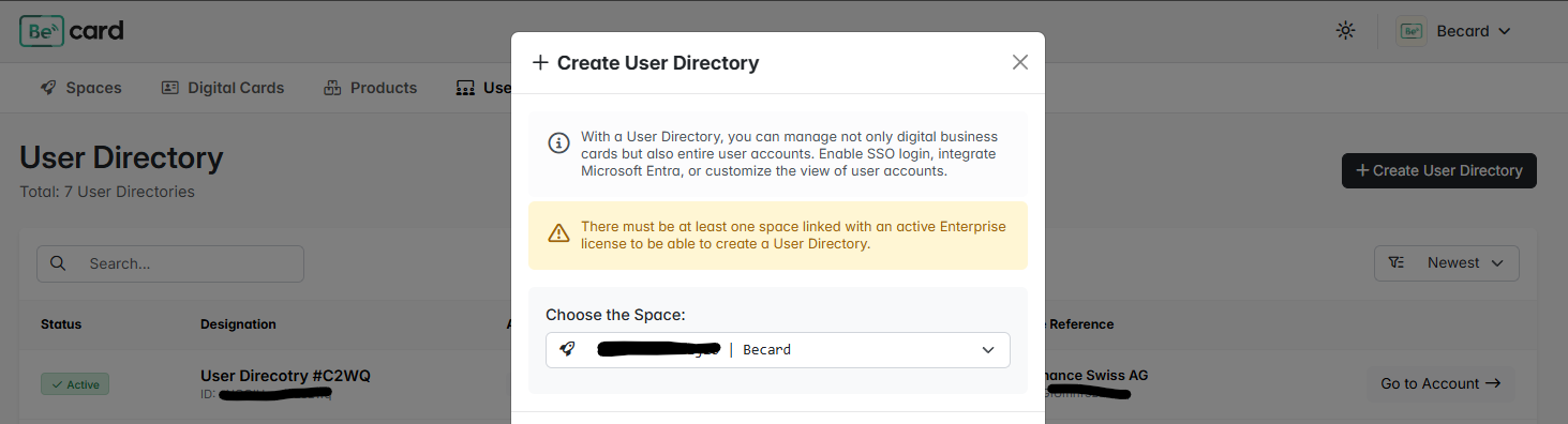 To perform the following steps, a Becard account with administrative rights in the Business Manager is necessary, as well as an existing space with an Enterprise license. To set up the Microsoft integration, we first need to open the respective directory under "User Directory" to link the corresponding space (License Reference). If no "User Directory" exists, we can create one by selecting "Create User Directory".